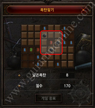 – Se han ocultado 8 bombas en el espacio abierto disponible. – Si el número 3 aparece, alrededor de las 8 casillas significa que hay 3 bombas. – Donde supuestamenta hay una bomba, puede poner una «Card Bomb» haciendo “Clic Derecho”. – Para cancelar al poner una «Card Bomb» puedes hacer otra vez “Clic Derecho”. – El juego termina al pisar una bomba. – Utilizando las «Card Bomb», el juego termina cuando no hay espacio disponible.