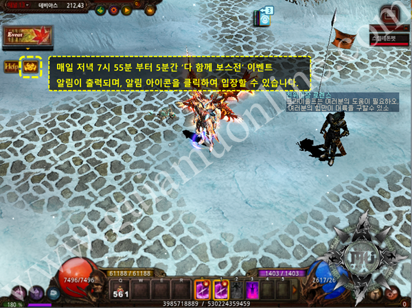 – Al comienzo del evento, aparecen 2 Boss. – Los personajes que participan en el evento infligen un daño Normal a los Boss, el objetivo es matar a todos los Boss que aparecen. – Si un personaje muere en el evento, se moverá a una zona segura del evento, puede continuar participando en el evento hasta que finaliza el evento. – No hay penalización de perdida de EXP o Zen al morir en el evento.