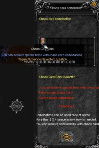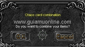 Chaos Card es una nueva opción agregada desde la versión Season 2 que tiene como finalidad la creación de items (excellent, Jewels, Pets, Tickets) mediante una Chaos Card la cual se compra con coins mediante el Mu Item Shop.