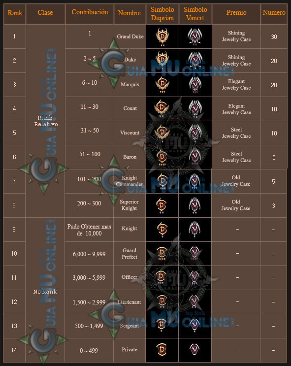Si se logra estar dentro del Rank Relativo podrás ganar Jewelry Case las cuales dropean Jewels y zen para pedir tu premio tienes que ir al NPC de la familia que perteneces y pedir tu premio.