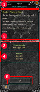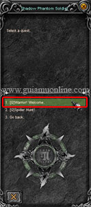 | Al crear un personaje nuevo y deseas saber más sobre el juego puedes empezar con el tutorial “Warrior welcome” el cual te guiara y te recompensara por cada quest completada. Para empezar la quest se tiene que hablar con el NPC Shadow Phantom Soldier que se encuentra ubicado en cada salida de los mapas Noria, Lorencia, Devias y Elbeland.